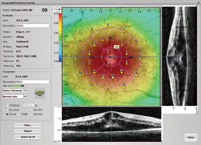 OCT/SLO cu modulul opţional de microperimetrie asigură clinicienilor posibilitatea de a afişa o imagine combinată a hărţii topografice OCT 3D cu harta funcţiei retiniene. Clinicianul poate să analizeze apoi modificarea în funcţia retiniană pe un punct specific al retinei şi să evalueze modul în care corespunde cu modificarea în structura retiniană în acel punct.