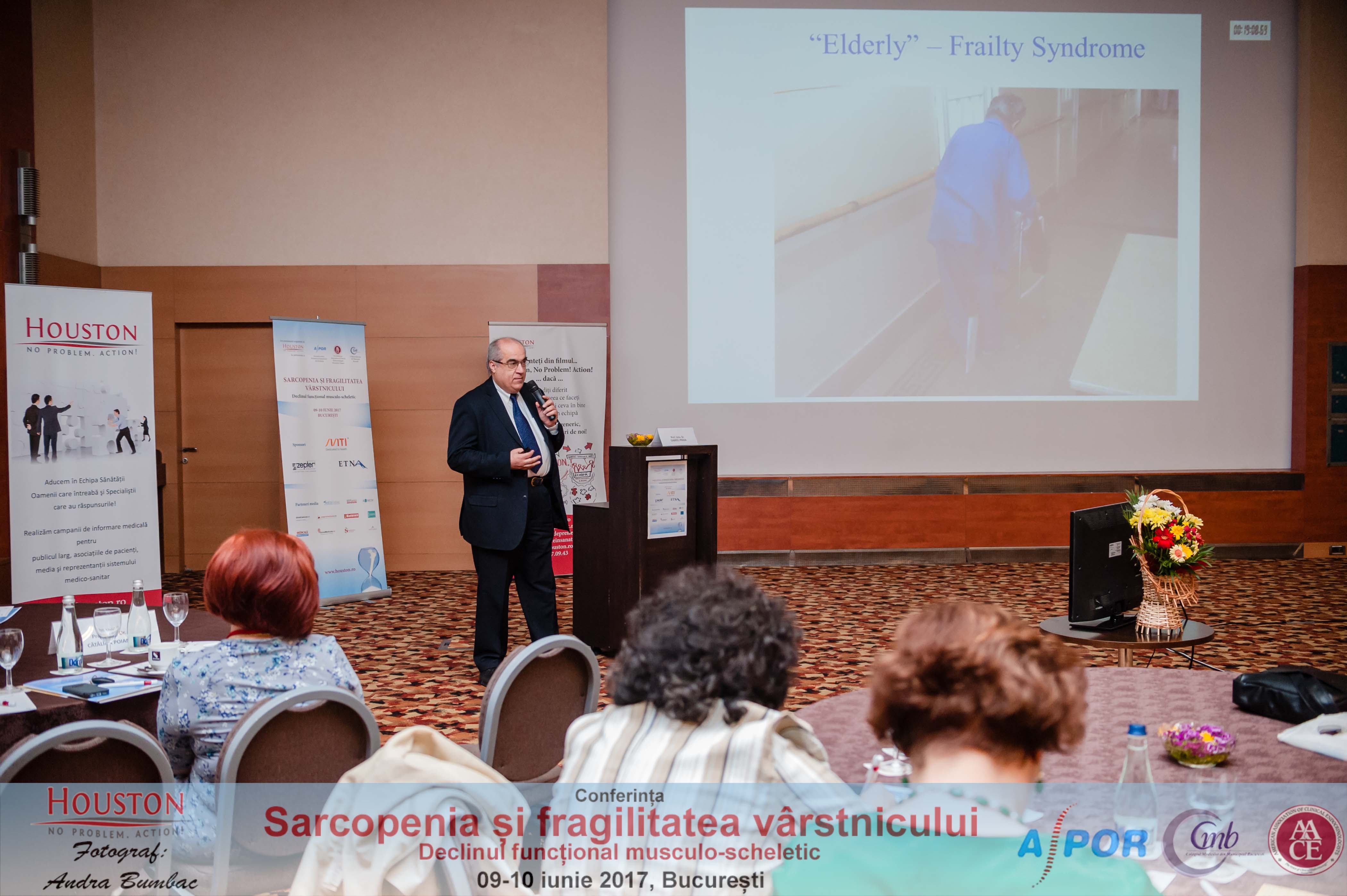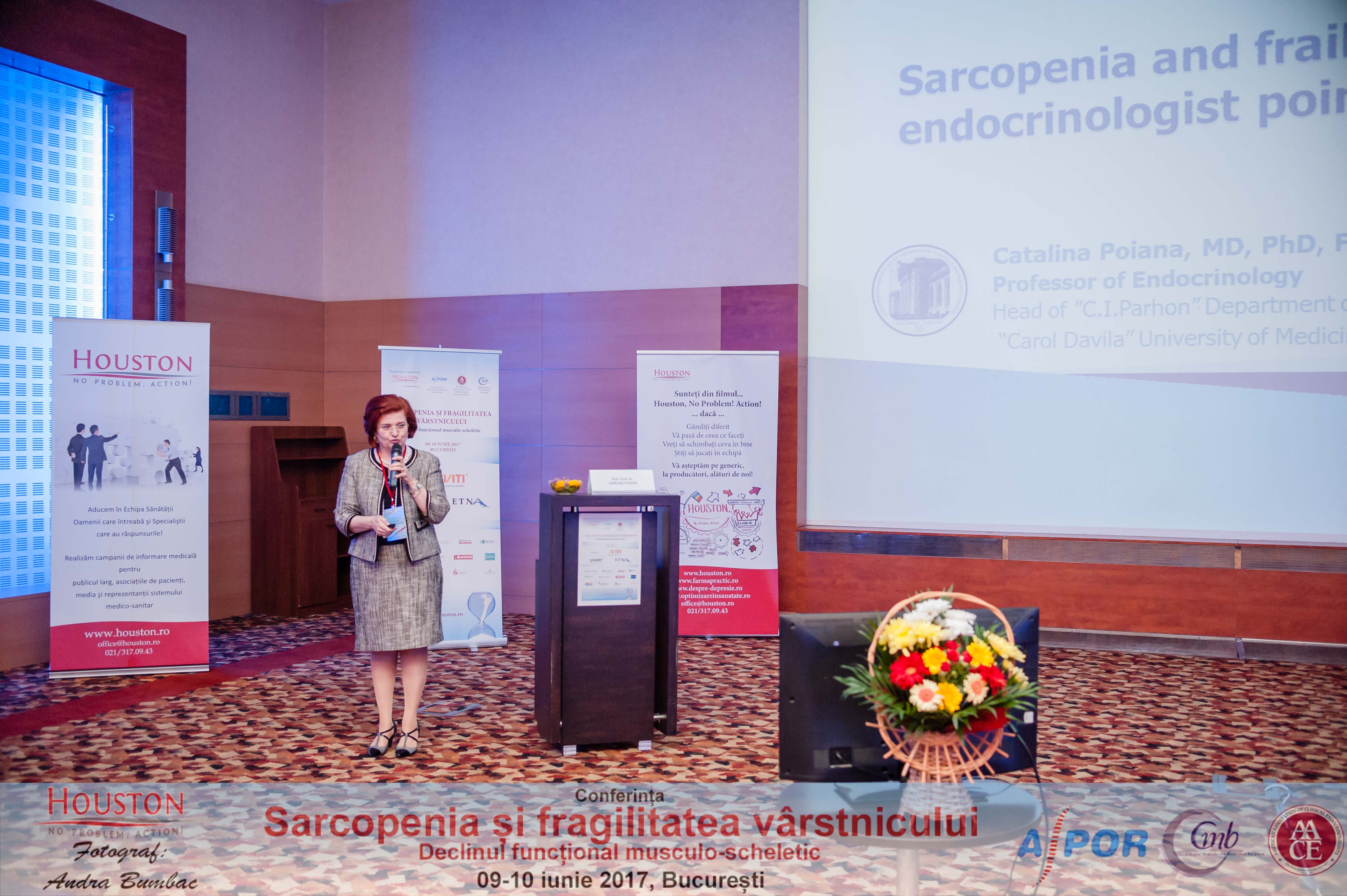Lucrările științifice au fost deschise de Prof. Univ. Dr. Cătălina Poiană, coordonatorul științific al manifestării, care a prezentat punctul de vedere al endocrinologului. „Suntem undeva ca Yin și Yang: hormonii anabolici scad - testosteronul, cortizonul crește, înaintăm în vârstă și câștigăm sarcopenie. Un alt element important este modificarea paternului de somn pe măsură ce înaintăm în vârstă și fragmentarea somnului. Reducerea somnului cu unde lente, trezirile frecvente și apneea de somn atrag un puternic dezechilibru hormonal, care presupune de asemenea, scădearea hormonului de creștere... Cu cât avem mai multe deficite hormonale și anomalii hormonale, cu atât sindromul de sarcopenie evoluează către ceea ce se cheamă sindromul de fragilitate al vârstnicului”, a afirmat președintele Colegiului Medicilor din Municipiul București.