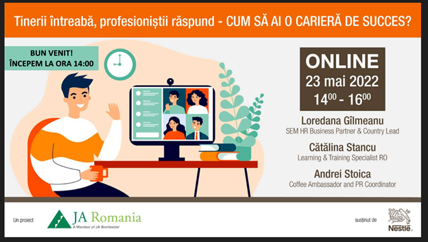 Junior Achievement România, în parteneriat cu Nestlé România, continuă programul de dezvoltare profesională “Succesul tău profesional”. În cadrul acestui proiect, cei doi parteneri derulează o serie de activități de tip learning by doing. În luna mai, voluntarii Nestlé s-au întâlnit virtual cu 525 de elevi și 45 de profesori din 23 de județe.