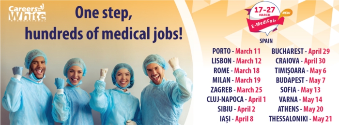 Mai multe informații despre Târgurile de Joburi pentru Personalul Medical organizate de Cariere în Alb primăvara aceasta în România se pot găsi pe www.careersinwhite.com