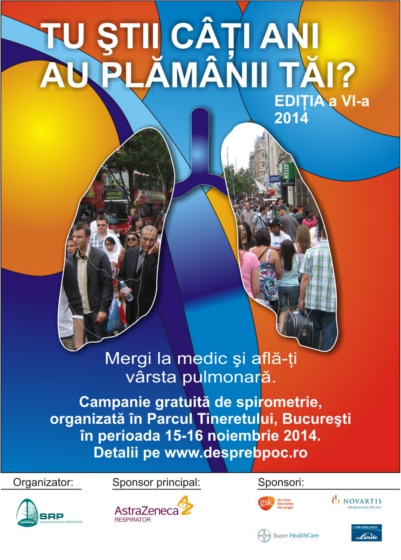 “Diagnosticarea la timp este obiectivul campaniei Tu ştii câţi ani au plămânii tăi?, aflatădeja la a şasea ediţie” spune prof. dr. Florin Mihălţan, preşedintele Societăţii Române de Pneumologie. “Şi în acest an facem testări gratuite şi îi îndemnăm pe toţi românii care fumează, tuşesc şi nu rezistăla efort săcaute pe www.desprebpoc.ro lista cabinetelor medicale unde se pot face spirometrii gratuite” continuăMihălţan.