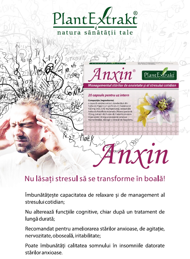 Pentru a reduce simptomele cauzate de stări anxioase, de agitaţie, nervozitate, oboseală, iritabilitate, vă propunem o cură cu Anxin, preparat natural ce îmbunătăţeşte capacitatea de relaxare şi de management al stresului cotidian, reducând stresul şi anxietatea într-o manieră blândă, printr-un mecanism similar celui fiziologic, de unde şi lipsa reacţiilor adverse.