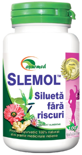 SLEMOL™ - complex de plante ayurvedice care contribuie la menținerea unei siluete armonioase, specifice tipologiei constituționale, a greutăţii normale a corpului și a unui echilibru fizic și psihoemoțional optim. Ajută la reglarea apetitului și optimizează procesele digestive şi tranzitul intestinal. Complexul de substanțe bioactive stimulează procesele de detoxifiere la nivel hepatic prin susținerea sistemului enzimatic endogen și a fluxului biliar. Contribuie la reducerea transformării glucidelor în lipide și crește nivelul energetic al organismului, prin intensificarea arderii grăsimilor la nivel celular, menținând greutatea corporală normală prin susținerea funcționării optime a sistemului endocrin și a echilibrului metabolic natural, fiind îmbunătățite tonusul și sănătatea organismului