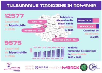 • În 2010, în România s-au înregistrat 35439 cazuri noi de boli tiroidiene. În 2016 au fost depistate de trei ori mai multe (83413 cazuri noi);