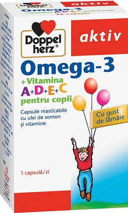 Însă pentru copiii obișnuiți cu meniul “pizza” & “ paste” este o condiție greu de îndeplinit, de aceea este recomandat un aport suplimentar de acizi grași nesaturați de exemplu prin aportul suplimentar de Omega-3 + Vitamina A+D+E+C, care pe lângă prețiosul ulei de somon bogat în acizi grași nesaturați mai conține și vitamine care au un efect pozitiv asupra imunității, dar și a capacitătii de creștere și dezvoltare a copiilor. Produsul poate fi administrat copiilor peste 3 ani, iar capsulele au un gust plăcut de lămâie, cu o capsulă pe zi fiind acoperit necesarul zilnic de Acizi grași esențiali.