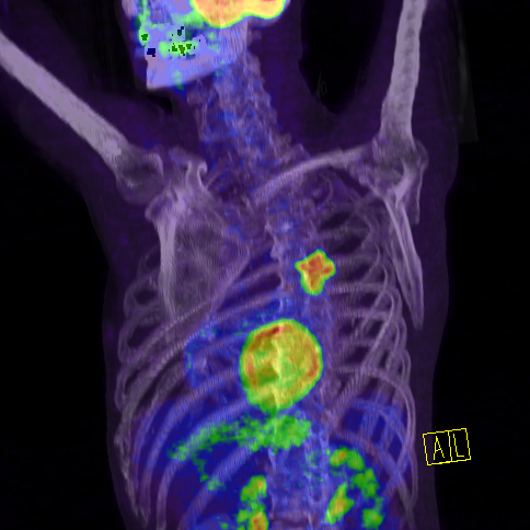 Imagine PET/CT a unei tumori pulmonare centrale pe partea stângă. Se observă că tumoarea malignă acumulează FGD, dar încă nu a dat metastaze în nodulii limfatici locali sau metastaze îndepărtate.
