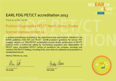 Acest tip de acreditare EANM Research Ltd (EARL) a fost lansat în 2010 şi se acordă doar centrelor europene de excelenţă în diagnosticarea cancerului. Precizăm faptul că acreditarea EARL este acordată de către membrii Comitetului Executiv al Asociaţiei Europene de Medicină Nucleară, sub egida Asociaţiei Europene de Medicină Nucleară, cu aprobarea Organizaţiei Europene pentru Cercetarea şi Tratamentul Cancerului (EORTC).