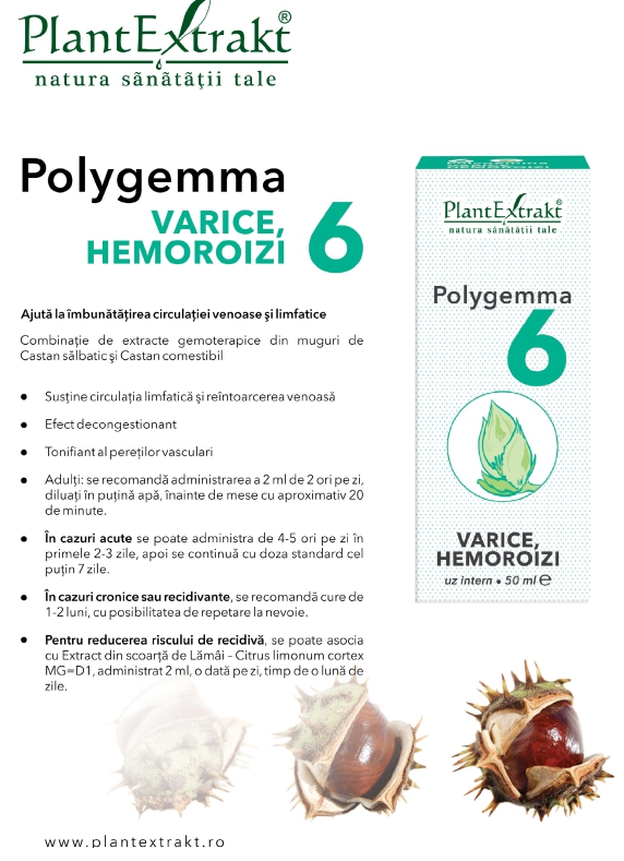 Puteţi apela şi la preparatul gemoterapic complex Polygemma 6 – varice, hemoroizi, eficient, aşa cum se observă şi din denumire, atât în cazul varicelor, cât şi al hemoroizilor.