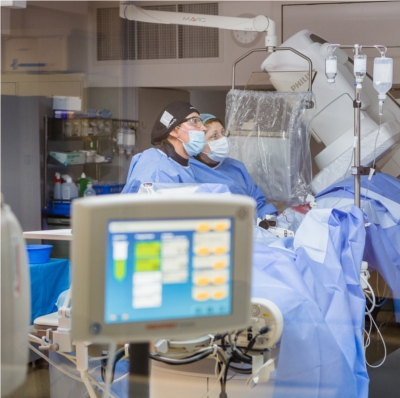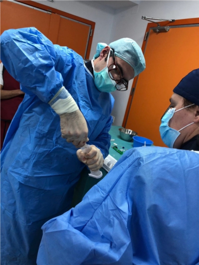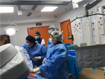 Cei doi pacienți au fost anesteziați în Laboratorul de Angiografie și Cateterism Cardiac al spitalului, de către medicii anesteziști dr. Mihaela Crăciun și dr. Anca Filip, echipa de chirurgi cardiovasculari formată din Conf. Univ. dr. Horațiu Moldovan, dr. Gabriel Vasile și dr. Elena Nechifor au asigurat abordul vascular femural, iar cardiologii intervenționiști dr. Rodica Niculescu și dr. Cristina Spînu au montat endoprotezele. Cele din urmă au fost asistate și îndrumate de către Prof. Triandafillos Giannakopoulos din Atena, chirurg vascular, proctor pentru endoprotezele de aortă Endologix.
