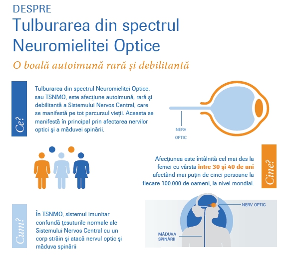 Tulburarea din spectrul Neuromielitei Optice, sau TSNMO, este o afecţiune autoimună, cronică, rară şi debilitantă a Sistemului Nervos Central. Aceasta se manifestă în principal prin afectarea nervilor optici şi a măduvei spinării.