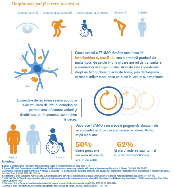 “Până recent, pacienţii care sufereau de Tulburarea din spectrul Neuromielitei Optice nu aveau parte de un tratament specific pentru această boală. Acum că avem acces la tratament, este deosebit de important ca persoanele care suferă de această boală să înceapă tratamentul cât mai repede după diagnosticarea sau debutul bolii, pentru a preveni severitatea recăderilor şi a preveni acumularea de leziuni neurologice. Educaţia medicală a pacienţilor cu privire la simptomele bolii poate fi un ajutor important pentru a diagnostica această boală cât mai rapid”, a declarat Dr. Romana Homorodean, medic primar neurologie, Spitalul Clinic Județean de Urgență Cluj-Napoca.