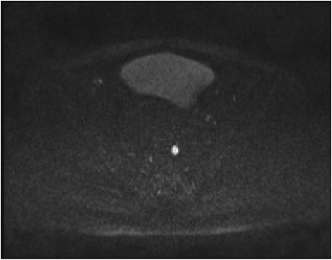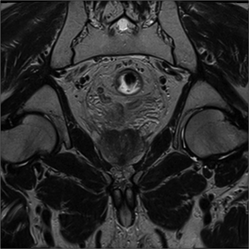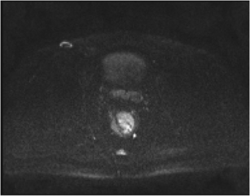 Fig.2. Același pacient post chimio-/ radioterapie – răspuns complet cu dispariția masei tumorale rectale; dispariția restricției de difuzie și reducere în dimensiuni a ganglionilor mezorectali; pacientul a beneficiat de TME şi s-a confirmat histopatologic absenţa ţesutului tumoral (pT0 pN0).