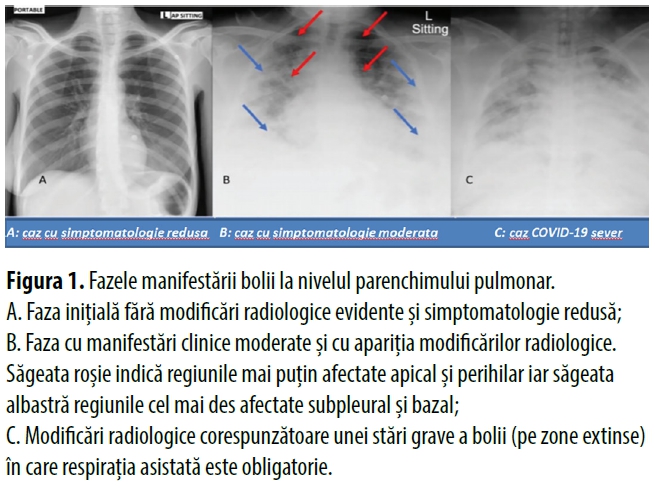 Examenele radiologice precum și evoluția clinică au identificat trei faze distincte ale evoluției bolii și anume: faza inițială, cu semne clinice de infectare minore; apariția semnelor clinice care necesita intervenție și internare pentru eventuala inițiere a ventilației; stadiul în care respirația asistată devine obligatorie. Afectarea țesutului pulmonar în cadrul evoluției clinice a infecției cu SARS-CoV-2 este redata în figura 1.