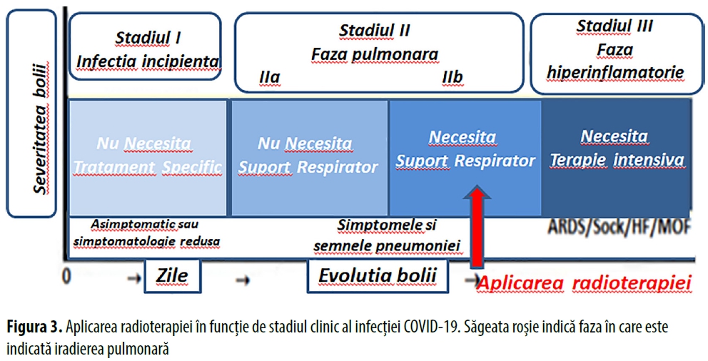Radioterapia cu doza redusa trebuie efectuată în faza II-a sau II-b a ciclului bolii (figura 3) astfel că intrarea în faza a III-a să nu aibă loc sau, dacă are loc, procesul inflamator la nivelul parenchimului pulmonar să fie mult atenuat de iradierea aplicată și fibrozarea să nu mai fie accentuată.