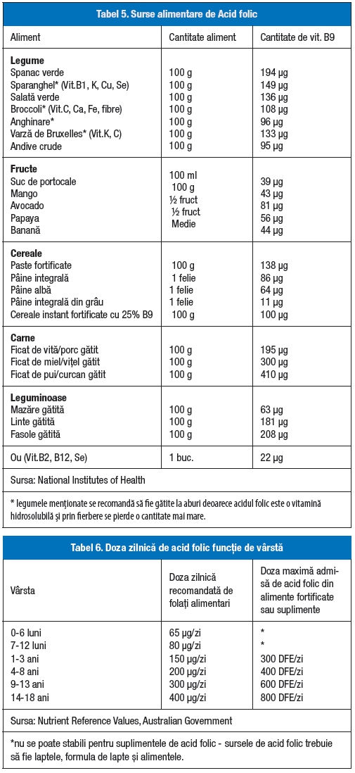 Doza zilnică recomandată de acid folic/folați în funcție de vârstă (Tabel 6) depinde de biodisponibilitate: