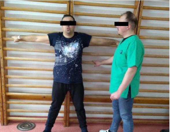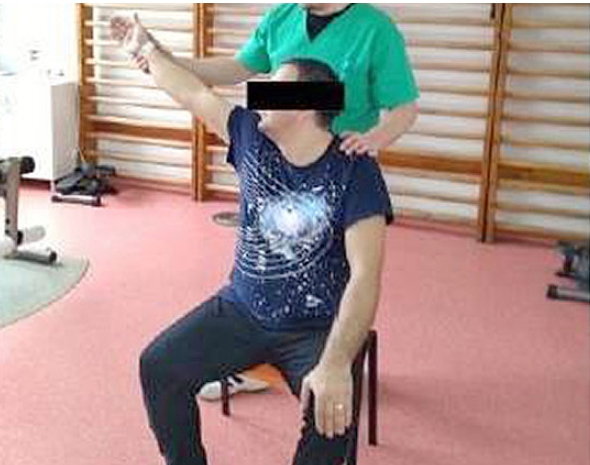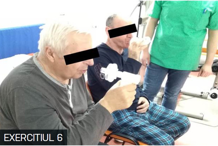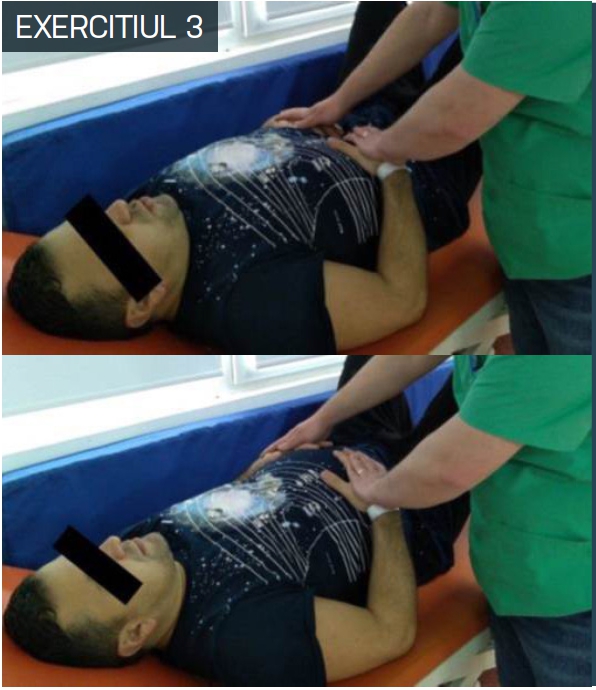 T1: Pacientul ridica membrul superior drept, lateral și în spate, cu inspir pe nas. T2: Pacientul coboară membrul superior în poziția inițială, cu expir pe gură