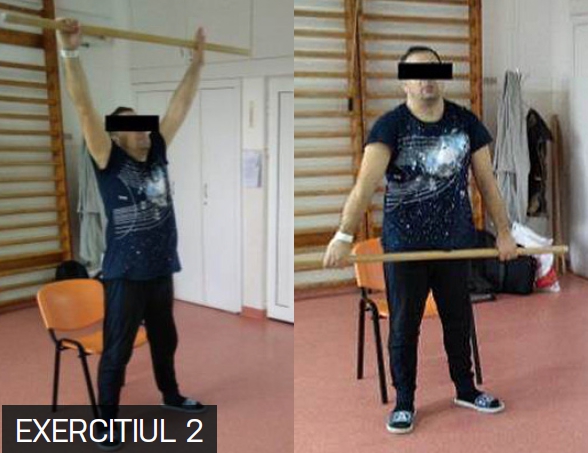 Pacientul realizează un exercițiu cu bastonul, respectând poziția inițială și timpii de execuție. P.I.: Stând cu membrele inferioare departate, cu bastonul în față, jos, ținut de capete.