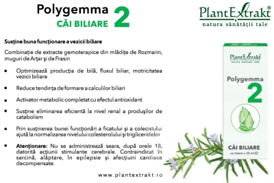 În preparatul Polygemma 2 - Căi biliare sunt reunite cele 3 extracte gemoterapice prezentate: mlădițe de Rozmarin, muguri de Frasin și muguri de Arțar. Recomandarea este de susținere a funcționării și detoxifiere la nivelul ficatului și căilor biliare. Se administrează 2ml o dată pe zi, dimineața, diluați în puțină apă, înainte de masă cu aproximativ 20 de minute, în cure de 1-2 luni. După mesele de sărbători, vă puteți gândi la o cură cu Polygemma 2-căi biliare.