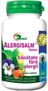 ALERGISALM™ - Sănătate fără alergii. Este o formulă bine tolerată, 100% naturală, conține un amestec de fitonutrienți care contribuie direct la menținerea funcțiilor fiziologice normale la nivel ocular, respirator, cutanat și digestiv în momentul contactului cu alergenii din mediu sau din alimentație. Acesta inhibă activitatea receptorilor de histamină, împiedicând astfel hiperreactivitatea organismului la alergeni.