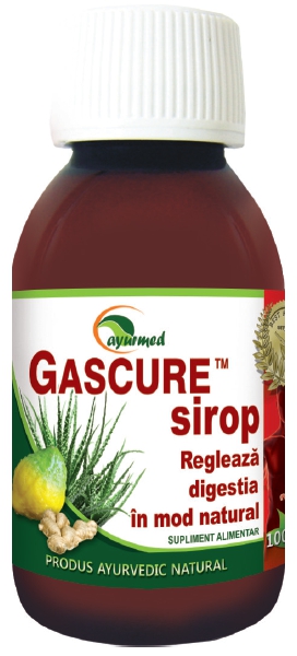 Suplimentul alimentar GASCURE sirop este un produs natural ayurvedic care acţionează uşor asupra glandelor gastrice, neutralizează hiperaciditatea şi asigură o digestie normală. Extractele din plantele medicinale ayurvedice din GASCURE protejează mucoasa gastrică, acţionează ca un balsam asupra leziunilor gastrice. Datorită acestor proprietăţi, sunt prevenite extinderea leziunilor gastrice, ajută la refacerea mucoasei gastrice şi intestinale, GASCURE SIROP are proprietăți carminative, antiseptice, reglează apetitul având proprietăţi de stimulare a acestuia şi îmbunătăţeşte digestia si absorbtia corespunzatoare a substanțelor nutritive în organism. GASCURE menține secreția de acid clorhidric gastric și enzime gastrice și intestinale care sunt responsabile pentru digerarea eficientă a hranei. Susține ficatul în secreția și creșterea fluxului biliar (bila este implicată în digestia și asimilarea grăsimilor) și în susținerea proceselor de detoxifiere. Stimulează secreția de enzime pancreatice, compuşi necesari pentru buna digestie și asimilarea de nutrienţi. Susține menținerea unui tranzit intestinal normal permițând astfel restabilirea florei intestinale, frecvenței și consistenței scaunelor, eliminarea din intestine a gazelor și toxinelor provenite dintr-o digestie deficitară, Gascure sirop prin susținerea funcțiilor gastrice, intestinale, hepatobiliare și a tranzitului intestinal ajută la eliminarea neplăcerilor cauzate de excesele alimentare sau alimente greu digerabile.