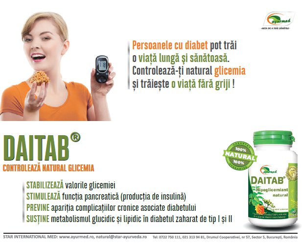Asa cum v-au obișnuit specialiștii Ayurmed® vă propun să încercați suplimentul alimentar DAITAB®. Un produs deja consacrat pe piața din România, care si-a dovedit eficiența în rândul pacienților, DAITAB® este un complex de plante ayurvedice, ce conține atât plantele enumerate mai sus cât și alte plante menite să îi potențeze efectul.