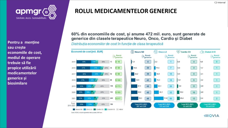 Cu toate astea, România are de patru ori mai puține medicamente generice decât Polonia, de două ori mai puține decât Cehia și de șase ori mai puține decât Germania. Există, deci, o oportunitate foarte mare de a genera economii suplimentare prin intrarea pe piață a unor noi medicamente generice.