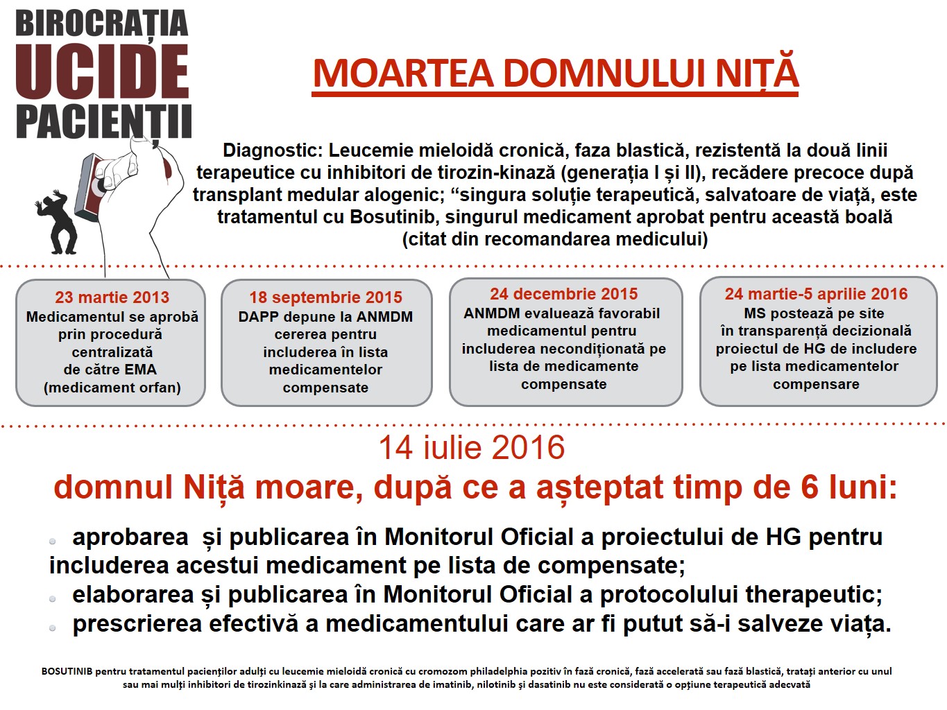 Domnul Niță a murit pentru că, deși încă din decembrie 2015 medicamentul de care avea nevoie a fost evaluat favorabil de Agenția Națională a Medicamentului și a Dispozitivelor Medicale pentru includerea necondiționatăpe lista de compensate, nici până azi nu s-a elaborat o hotărâre de Guvern.