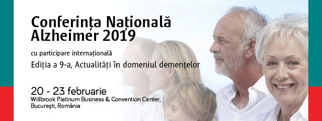 Conferința Națională Alzheimer, Ediția a 9-a, Actualități în domeniul demențelor, organizată de Colegiul Medicilor din Municipiul București în parteneriat cu Societatea Română Alzheimer, se desfășoară în perioada 20 - 23 februarie 2019, în București, la Willbrook Platinum Business & Convention Center.