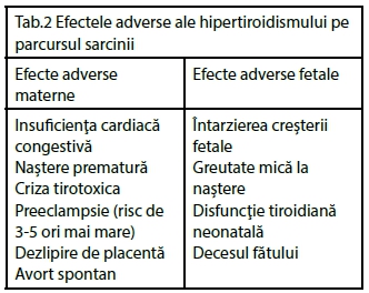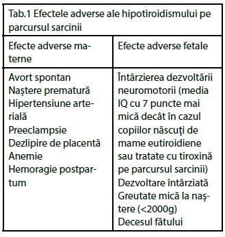 Hipotiroidismul este disfuncţia tiroidiană cu cele mai severe efecte adverse atât asupra mamei, cât şi asupra fătului. Acestea sunt prezentate în tab 1.