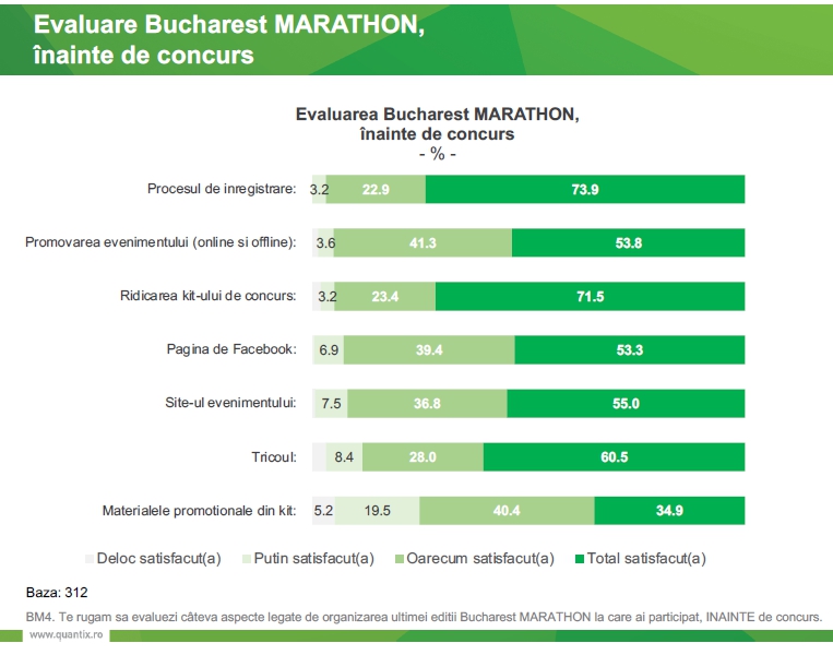 - referitor la etapele de pregătire a evenimentelor: nivelul de satisfacție este ridicat pentru fiecare atribut evaluat (procesul de înregistrare, promovarea online și offline, ridicarea kitului de concurs, website-ul evenimentelor, paginile de social media, tricoul);