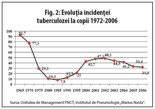 Incidenţa tuberculozei la copii a crescut continuu, de la 7,9%ooo în anul 1985 până la 48,2%ooo în anul 2002. Se remarcă acelaşi trend descrescător al incidenţei tuberculozei la copii începând cu anul 2003 (44,3%ooo), care continuă şi în 2004 (41,2%ooo), 2005 (33,4%ooo) şi 2006 (31,8%000).- Fig. 2