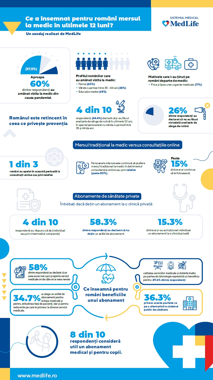MedLife, cel mai mare operator de servicii medicale private din România, face cunoscute rezultatele celui mai recent sondaj, realizat în perioada 05-10 noiembrie 2021, pe un eșantion de 504 respondenți din mediul urban, utilizatori de internet, cu vârste cuprinse între 25 și 55 de ani, 53.8% dintre respondenți, având în gospodărie copii cu vârste sub 18 ani. Rezultatele sondajului arată comportamentul românilor în privința mersului la medic în timpul pandemiei și a prevenției în sănătate, motivele pentru care au fost la medic în ultimele 18 luni și atitudinea față de importanța unui abonament individual de sănătate.