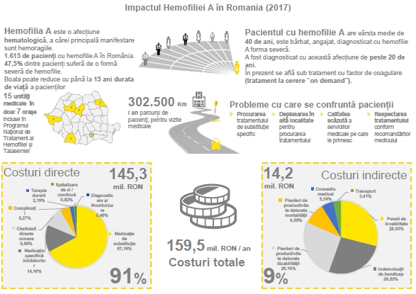 În ceea ce priveşte aspectul economic şi social al bolii, potrivit rezultatelor studiului, costurile totale ale hemofiliei în România sunt de 160 milioane RON anual (35 milioane EUR), din care 91% reprezintăcosturi directe, respectiv diagnostic, tratament şi monitorizare a bolii, în timp ce 9% sunt costuri indirecte (pierderi de productivitate, pensii şi indemnizaţii de handicap, concedii, transport).
