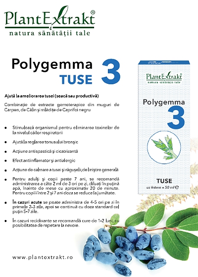 Aceste trei gemoterapice – Caprifoi, Carpen şi Călin - intră în compoziţia preparatului Polygemma 3 – Tuse, ce se poate administra, în cazuri acute de 4-5 ori pe zi în primele 2 zile, iar apoi de 3 ori pe zi, continuând administrarea câteva zile şi după ameliorare. În cazuri cronice sau recidivante se recomandă o cură de o lună de zile. Nu uitaţi, tusea este un simptom neplăcut, dar poate fi de multe ori repede tratată, folosind gemoterapia, terapia cu extracte din părţi tinere de plante, ce conţin celule stem vegetale.