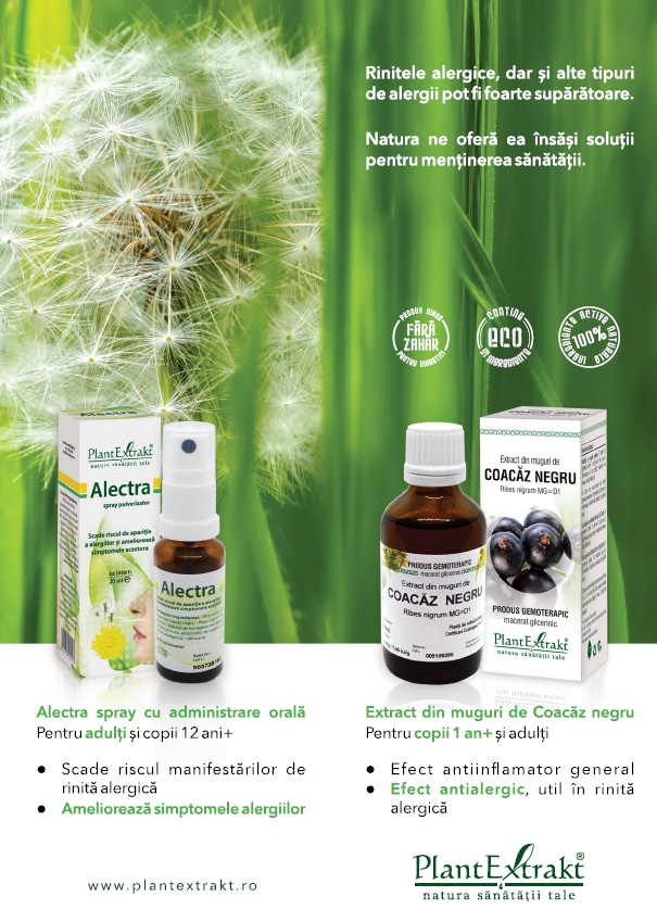 În paralel cu medicația antialergică (când aceasta se impune), propunem terapia naturală cu Alectra - spray cu efect de cortizon natural - produs original Plantextrakt, cu ingrediente active 100% naturale, pentru reducerea manifestărilor din alergiile sezoniere, precum și cu posibilitatea de ameliorare a simptomelor din alergii și chiar de a limita nevoia de medicamente antialergice (sub control medical).