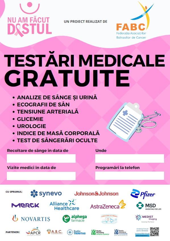 În weekend-urile din perioada 28 septembrie - 24 noiembrie 2024, peste 1000 de persoane din mediul rural vor beneficia de testări medicale gratuite în cadrul caravanei „Nu am făcut destul”, organizată de Federația Asociațiilor Bolnavilor de Cancer (FABC). „Nu am făcut destul” este o caravană de testări și analize medicale gratuite în mediul rural, ajunsă la a XI-a ediție.