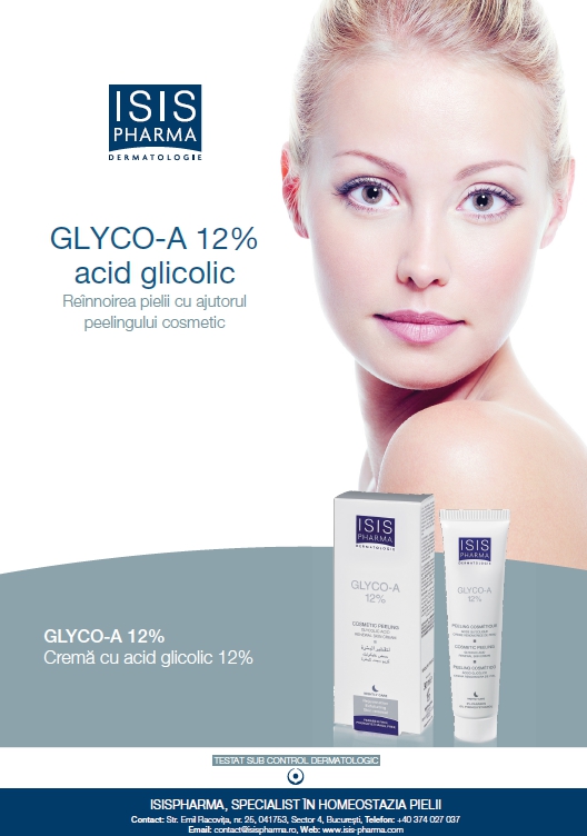 Dacă nu sunteţi adepta saloanelor de înfrumuseţare, puteţi realiza un peeling cosmetic la dumneavoastră acasă pentru reînnoirea pielii, cu ajutorul cremei Glyco-A cu 12% acid glicolic. Produsul este recomandat pentru prevenirea și tratamentul îmbătrânirii pielii, melasma și pigmentarea pielii, ihtioză, acnee și ten gras, xeroză și piele uscată, vergeturi. Acidul glicolic stimuleaza sinteza de colagen redand elasticitatea pielii.