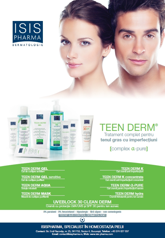 Protocolul de îngrijire poate fi completat cu aplicarea cremei hidratante TEEN DERM hydra a cărei compoziţie a fost special adaptată tenului acneic sensibilizat de efectele secundare ale tratamentelor medicale împotriva acneei. Selecția celor 5 ingrediente active care acţionează sinergic, întăresc funcţia de barieră a pielii şi ajută la refacerea echilibrului natural al pielii. TEEN DERM hydra conţine emolienţi şi ingrediente naturale care ajută la hrănirea şi refacerea pielii, reglează secreția în exces de sebum și are efect anti-inflamator.