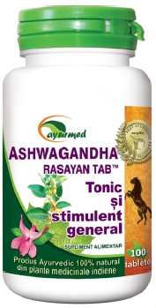 ASHWAGANDHA RASAYAN TAB este un tonic general complet, obținut dintr-un amestec de plante medicinale indiene cunoscute pentru proprietățile lor de revigorare, regenerare și tonifiere, menținând nivelul de energie din organism. Withania somnifera (ginseng indian) susține capacitatea organismului de a menține homeostazia și vitalitatea și ajută la refacerea fizica și psihica după stări de oboseala și stres. Susține echilibrarea sistemului imunitar și sistemul antioxidant endogen, contribuind astfel la menținerea capacității naturale de autoapărare și refacere a organismului. ASHWAGANDA RASAYAN TAB contribuie la relaxarea psihică, apariția și menținerea calității somnului, menținerea capacității de concentrare, memorare și funcționare normala a sistemului nervos în situații de stres, surmenaj, suprasolicitare fizică și intelectuală. Rădăcina de Withania somnifera (Ginseng indian) are proprietatea de a proteja celulele creierului împotriva efectelor nocive ale stilului de viață modern. Studiile de specialitate efectuate de-a lungul timpului au relevat eficiența plantei în inhibarea creșterii mai multor tipuri de tumori. Fitonutrientii din plante susțin organismul împotriva îmbătrânirii premature prin menținerea echilibrului fizic, hormonal, psiho-emotional și eliminarea pe cale naturală a toxinelor din organism.