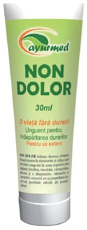 Unguentul NON DOLOR™, cu acțiune locală, externă, prezintă principii active ce se absorb profund prin piele și ameliorează rapid durerea locală specifică afecțiunilor articulare, suprasolicitărilor fizice sau traumatismelor osteo-articulare. Calmează durerile musculare difuze sau localizate, crampele musculare, durerile după efort fizic intens și contuziile. NON DOLOR™