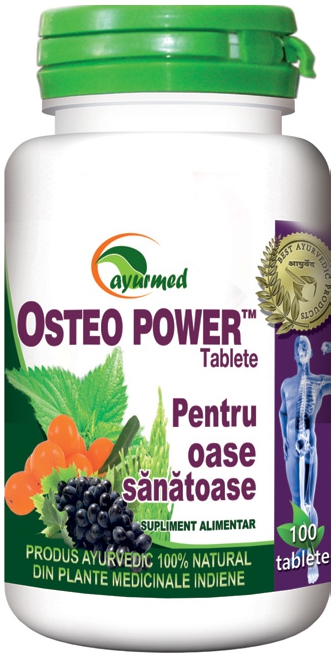 OSTEO POWER™ este un compus din plante ayurvedice care contribuie la formarea și menținerea structurii și mineralizării țesutului osos, a dinților, părului și unghiilor. Vitaminele și mineralele (Ca, Si, K, Mg, Fe etc.) prin absorbția și depunerea lor în oase, mențin densitatea întregului sistem osos iar în cazul fracturilor susțin procesul natural de refacere și remodelare a calusului. Susține formarea colagenului care contribuie la procesul de refacere a oaselor, tendoanelor, ligamentelor și cartilajelor în caz de traumatisme sau efort fizic prelungit. Benefic și recomandat persoanelor vârstnice, sportivilor sau persoanelor cu deficit de minerale.