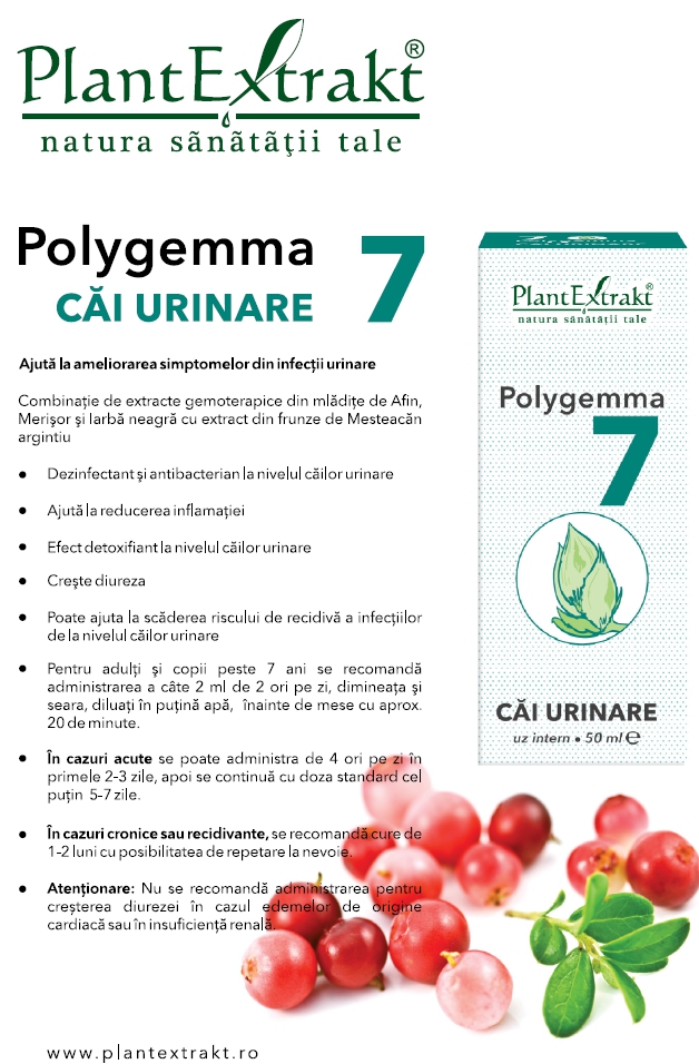 O altă abordare pe care v-o propun, este administrarea unui preparat gemoterapic complex, Polygemma 7 - Căi urinare. Acesta conține extracte gemoterapice din mlădiţe de Afin, de Merişor şi de Iarbă neagră, în asociere cu extract din frunze de Mesteacăn argintiu. Extractele gemoterapice obţinute din plante din familia Ericaceae – Afinul, Merişorul şi Iarba neagră - conţin un component activ principal, derivatul hidrochinonic arbutina, care se transformă prin hidroliză la nivel intestinal în hidrochinonă, cu acţiune antiseptică, antibacteriană şi antiinflamatoare la nivelul căilor urinare. În plus, extractul din frunze de Mesteacăn din formula produsului, are acţiune diuretică, fiind etalonul de produs vegetal diuretic, precum şi acţiune antiseptică şi antibacteriană, favorizând dezinfectarea căilor urinare în caz de infecţii.