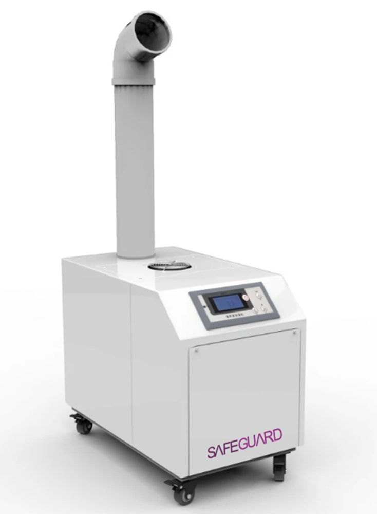 SafeGuard OptiMax foloseste un atomizator ultrasonic de mare intensitate pentru a pulveriza solutia dezinfectanta în picaturi ultra-fine (1~ 5 µm), creand o ceata densa de microparticule.