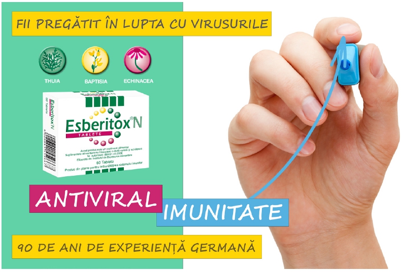 Este singurul produs condiționat și pentru sugari/copii/adulți. Studiile clinice au demonstrat că Esberitox®N Tablete administrat de la primele semne de viroză, scade perioada de boală cu 3 zile, boala este mai ușoară, iar pacienții se vindecă mai repede