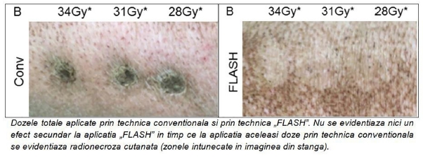 În figura de mai jos sunt reproduse efectele secundare la nivelul tegumentului la o aplicație cu doze totale “convenționale”, adică o aplicație ce a durat de ordinul minutelor, în comparație cu procedura FLASH cu aceași doză totală cu durată de milisecunde. S-a putut observa că necroza de la iradierea convențională nu apare la aplicația FLASH.