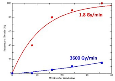 Scăderea incidenței fibrozei pulmonare (linia albastră) prin utilizarea iradierii tip FLASH 3600 Gy/min în comparatie cu iradierea convențională cu 1,8 Gy/m (curba roșie).