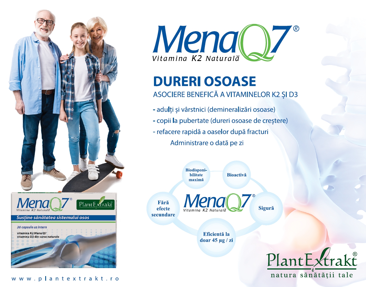 În ceea ce privește sănătatea oaselor, MenaQ7 – vitamina K2 naturală este recomandată persoanelor predispuse la demineralizări osoase (în special femeilor la premenopauză şi menopauză), copiilor la pubertate, în perioada de creştere.