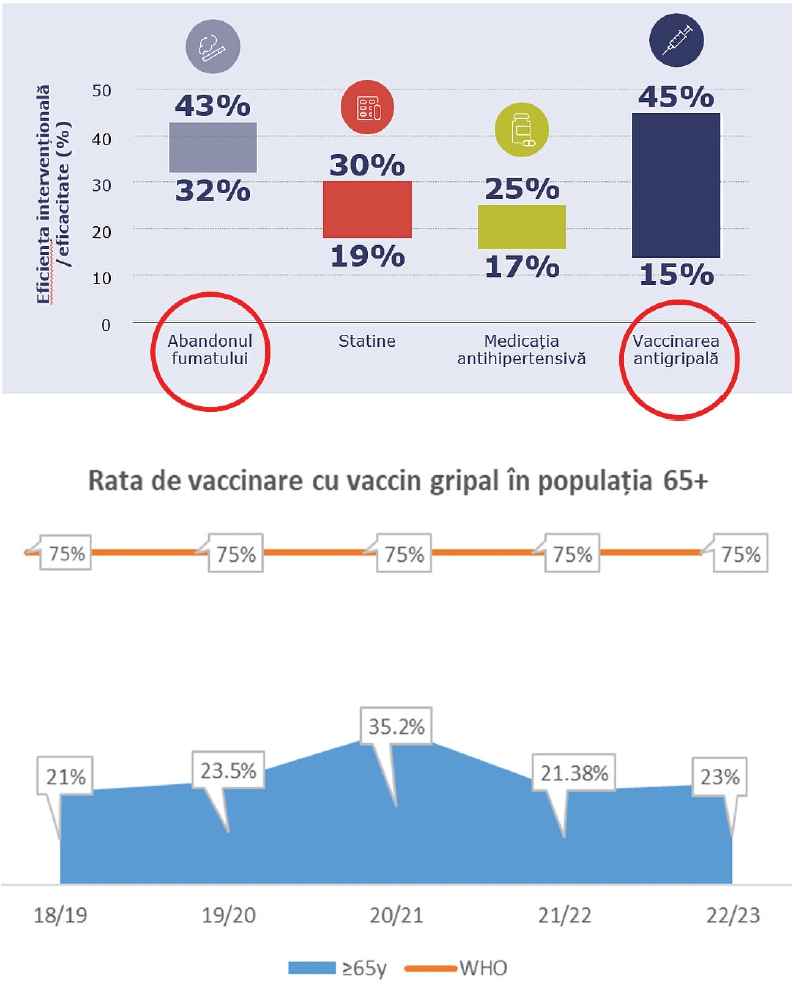Vaccinarea antigripală este recomandată de OMS să acopere 75% din populația peste 65 de ani! În România, în ultimi cinci ani, rata de vaccinare antigripală a fost doar între 21 și 35%!