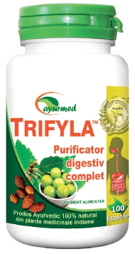 TRIFYLA este un supliment alimentar 100% natural ayurvedic fiind un amestec de fructe care protejează sistemul digestiv, menține flora intestinală sănătoasă, ajutând la evacuarea intestinului gros și la eliminarea toxinelor. Emblica officinalis, una din plantele din compoziția produsului este o sursă foarte bogată de vitamina C, cu efect diuretic şi laxativ.