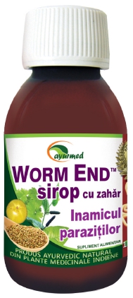 AYURMED vă oferă de asemenea și produsul WORM END Sirop, un produs ayurvedic, supliment alimentar natural, care este eficient pentru îndepărtarea tuturor paraziților intestinali: tenii, ascarizi (limbrici), oxiuri, Giardia Lamblia. Combate cu rezultate bune simptomele neplăcute asociate parazitozelor intestinale, având drept efect stimularea poftei de mâncare, stimularea secrețiilor gastrice și intestinale, dispariția senzației de greață, calmarea durerilor abdominale și facilitarea eliminării gazelor intestinale. WORM END